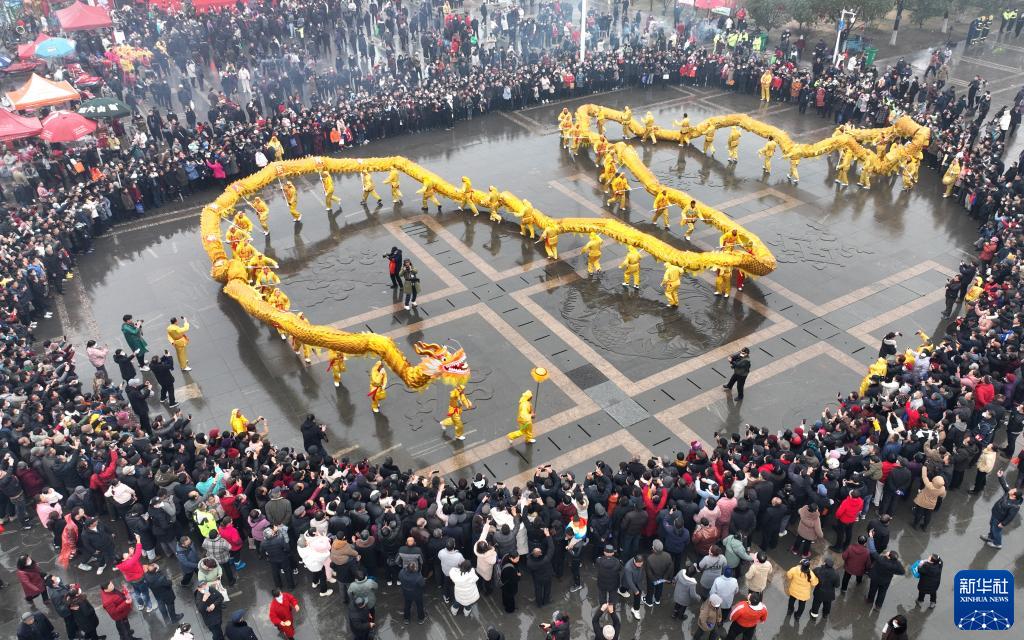 2月6日,人们在全椒县太平文化广场观看舞龙表演(无人机照片)。
