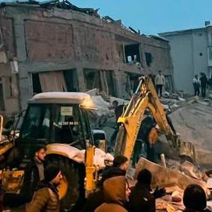 2月6日,人们在土耳其马拉蒂亚一处倒塌的建筑上搜救。