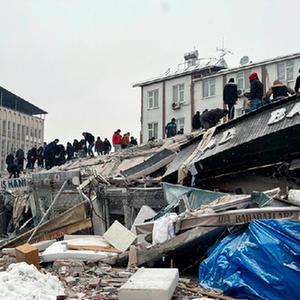 2月6日,人们在土耳其马拉蒂亚一处倒塌的建筑上搜救。