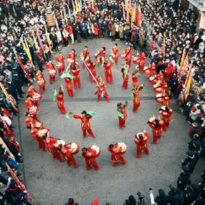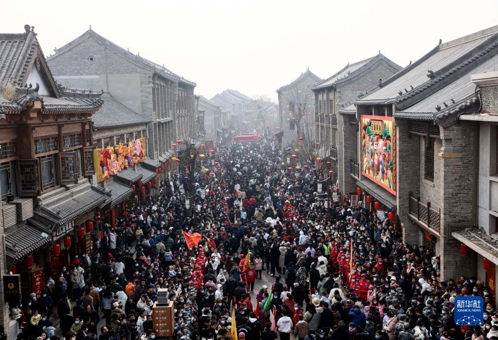 当日是农历正月十六,在河南省浚县举行的正月古庙会上,几十支社火团队轮番表演,踩高跷、扭秧歌、耍狮子,锣鼓喧天,热闹非凡,形成一道富有特色的中原文化景观。河南省浚县的正月古庙会已有1600多年历史,有“华北第一庙会”之称,被誉为民俗文化的“活化石”,是中国民间文化保护工程项目、国家级非物质文化遗产。