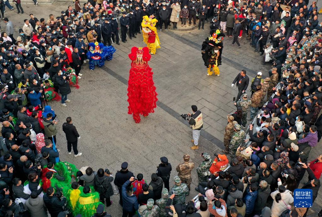 2月6日,社火团队的演员在庙会上表演舞狮(无人机照片)。
