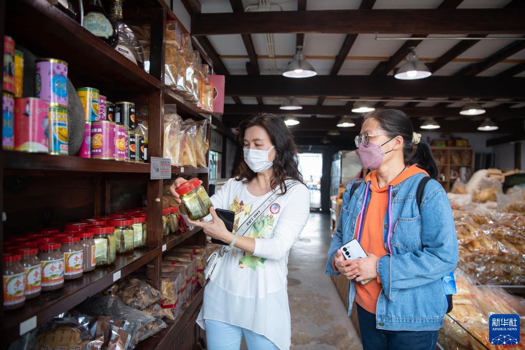 2月6日,广东省赴澳门首发团成员在路环选购澳门特色虾酱。
