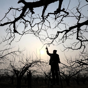 2月6日,石家庄市赵县精园梨果专业合作社果农在梨园给梨树修剪枝条。