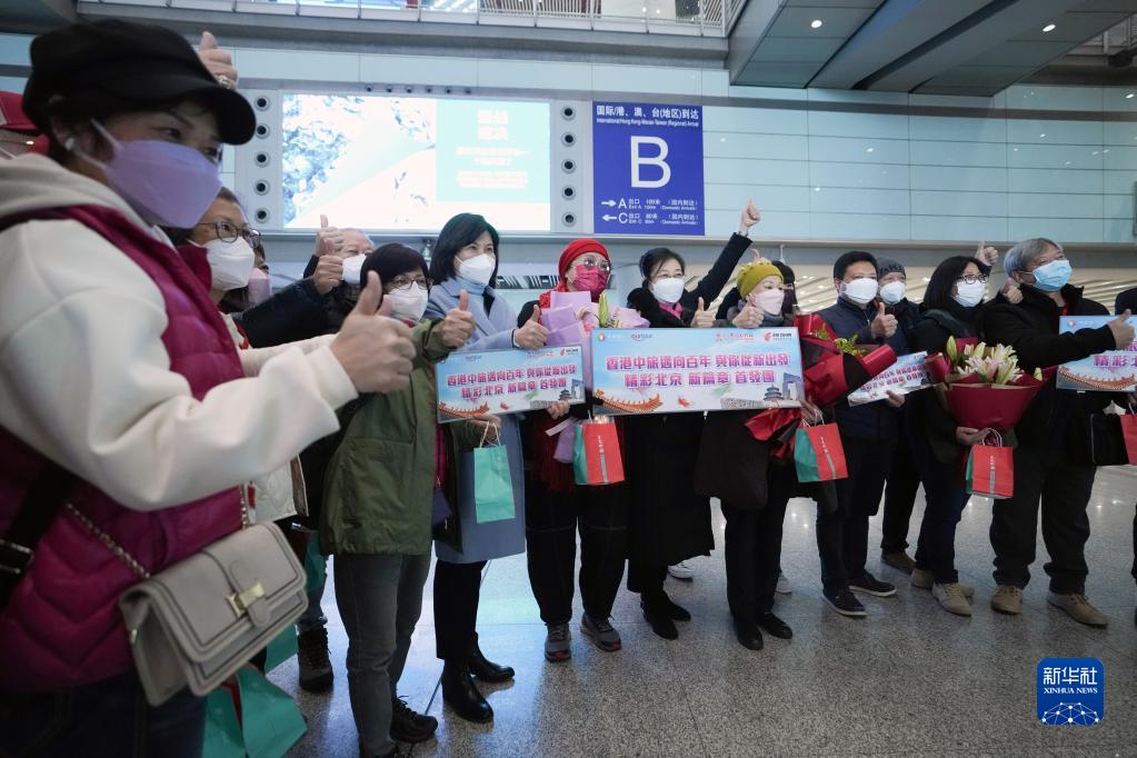 2月6日,内地与港澳人员往来全面恢复后,香港赴北京首个旅游团的游客在首都国际机场合影留念。