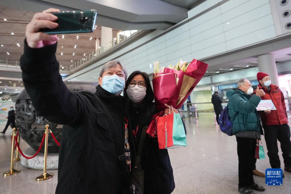 2月6日,内地与港澳人员往来全面恢复后,香港赴北京首个旅游团的游客在首都国际机场合影留念。