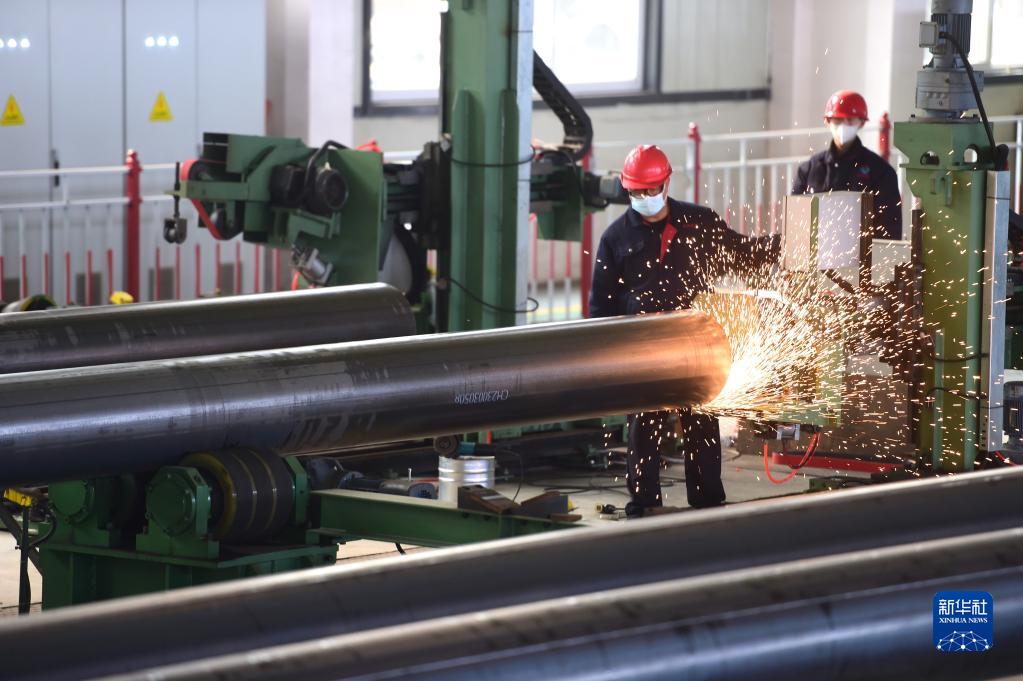 2月7日,河北盐山县一家管道企业的工人在生产输气钢管。
