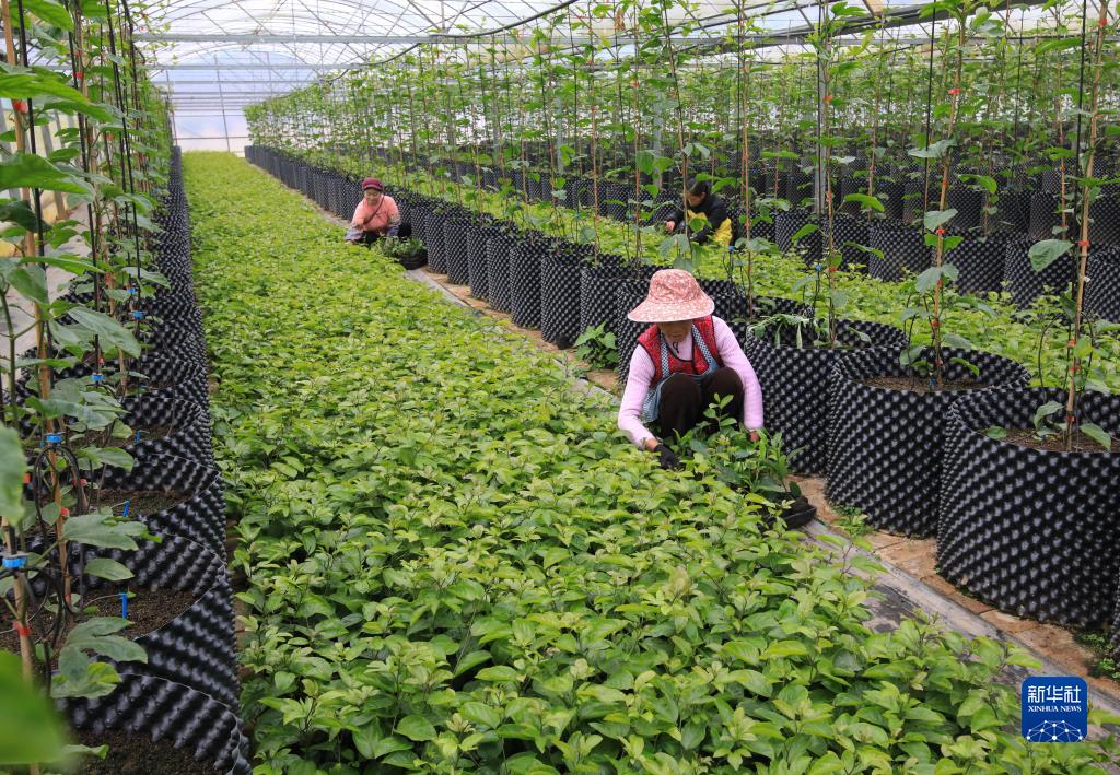 2月7日,工人在贵州省黔东南苗族侗族自治州从江县贯洞镇一家种苗繁育基地管护百香果秧苗。