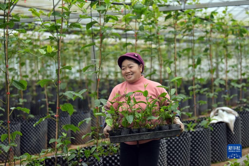 2月7日,工人在贵州省黔东南苗族侗族自治州从江县贯洞镇一家种苗繁育基地搬运百香果秧苗。