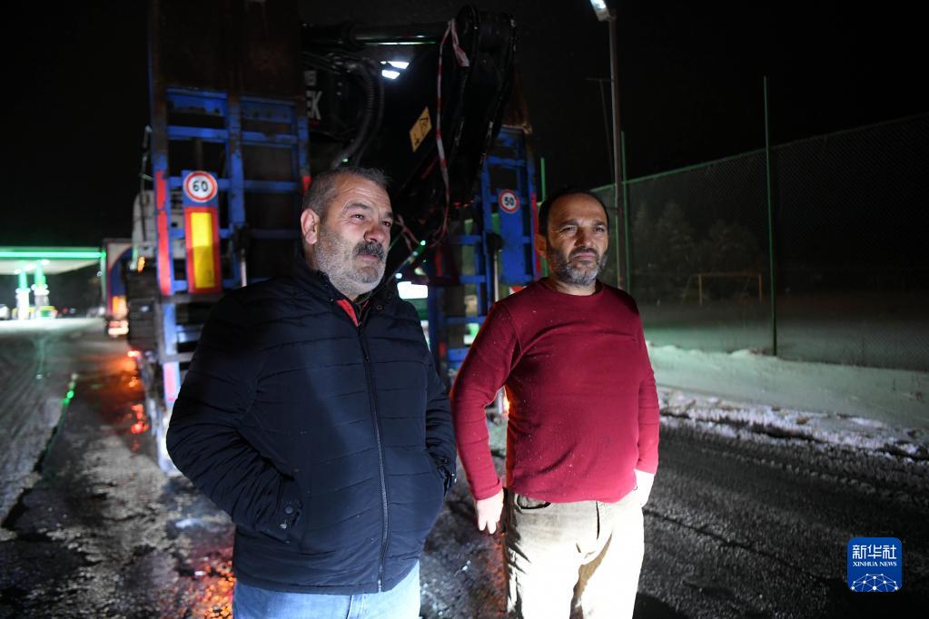 2月6日晚,在土耳其伊斯坦布尔至安卡拉公路上,货车司机艾哈迈德·莫里斯(右)告诉记者,他驾驶重型挖土机前往灾区加济安泰普省,将参与当地救援工作。
