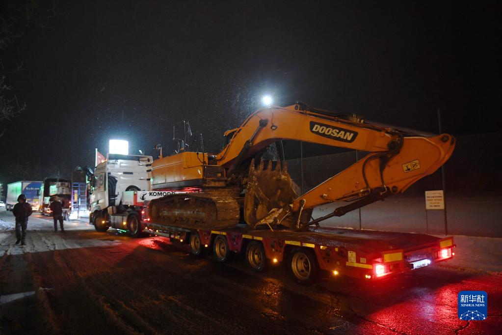 这是2月6日晚在土耳其伊斯坦布尔至安卡拉公路上拍摄的运往灾区的大型机械。