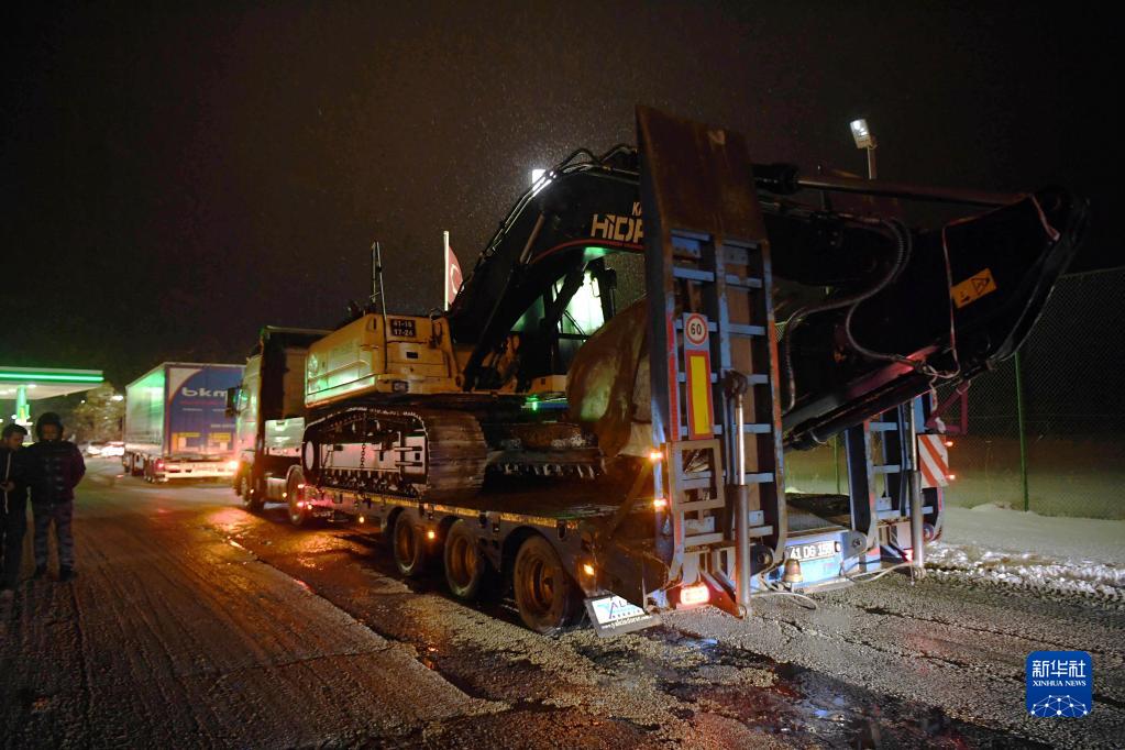 这是2月6日晚在土耳其伊斯坦布尔至安卡拉公路上拍摄的运往灾区的大型机械。