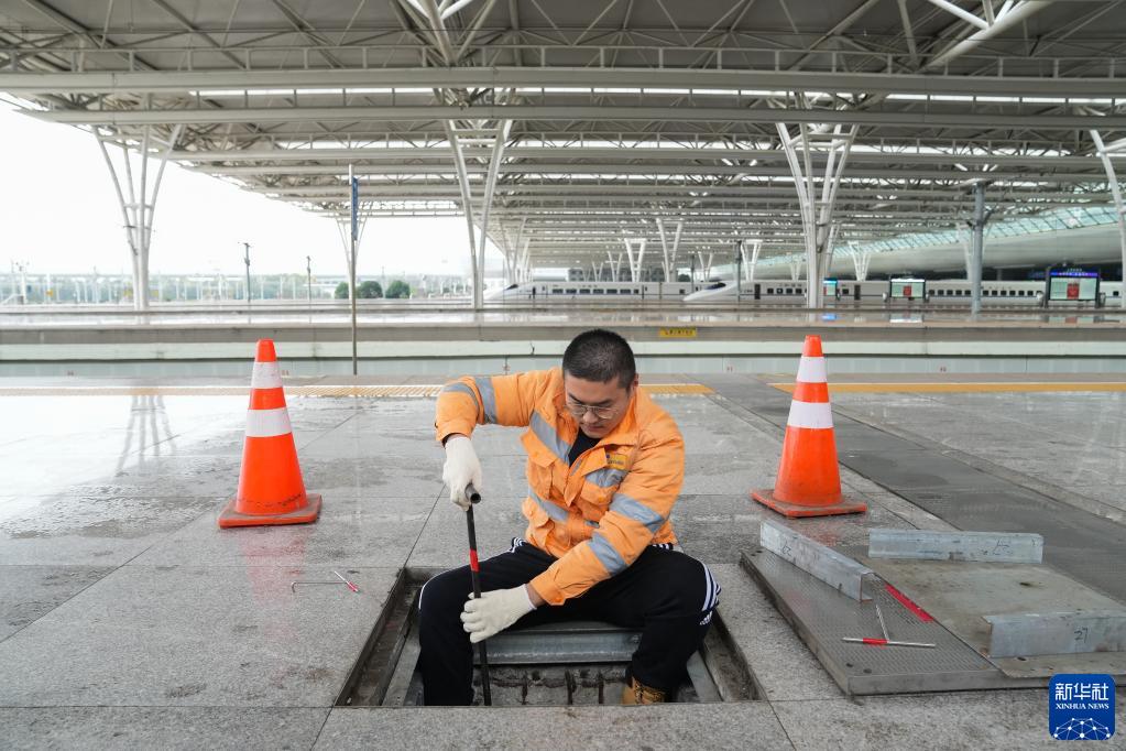2月7日,在上海虹桥火车站,上海房建公寓段工作人员在检修站台的地下式消火栓。