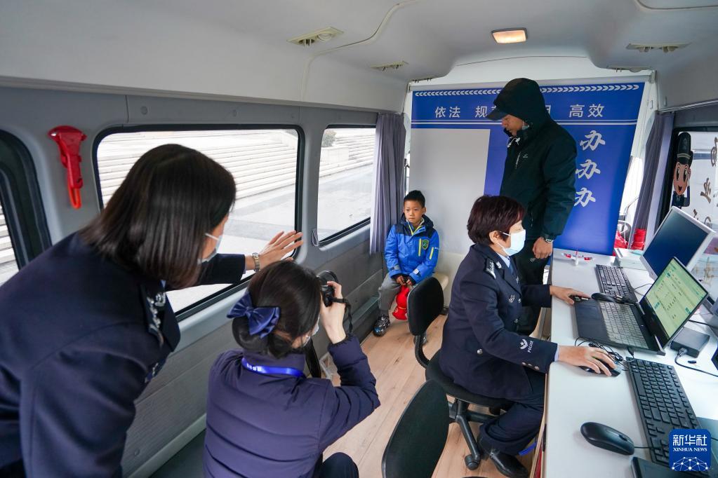 2月7日,南京市公安局建邺分局政务服务管理大队民警在综合服务流动车上为一名儿童采集身份证照片。