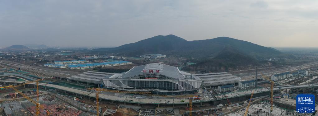 2月7日拍摄的江苏南沿江铁路江阴站站房(无人机照片)。