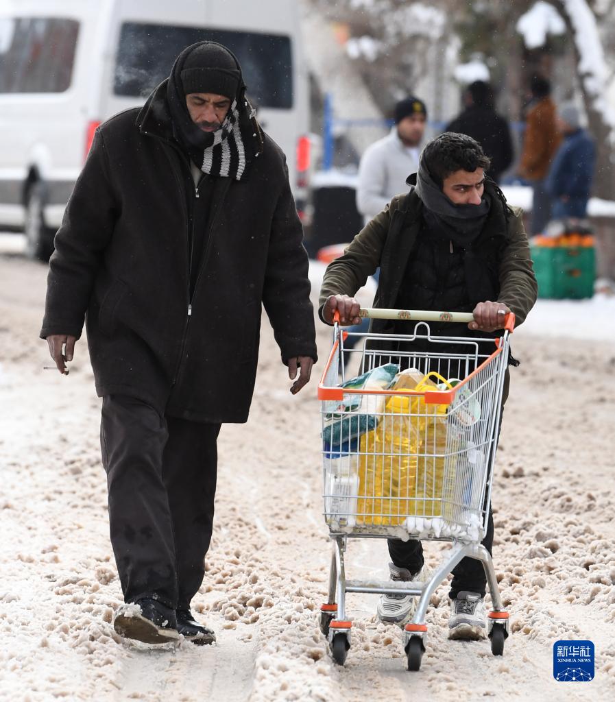 2月7日,在土耳其卡赫拉曼马拉什省的埃尔比斯坦地区,当地居民在街头运输物资。