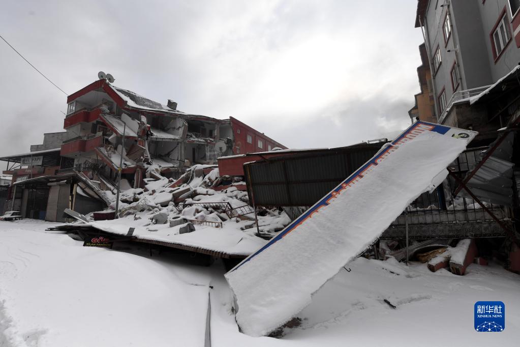 这是2月7日在土耳其卡赫拉曼马拉什省南部的埃尔比斯坦地区拍摄的地震中受损的建筑物。