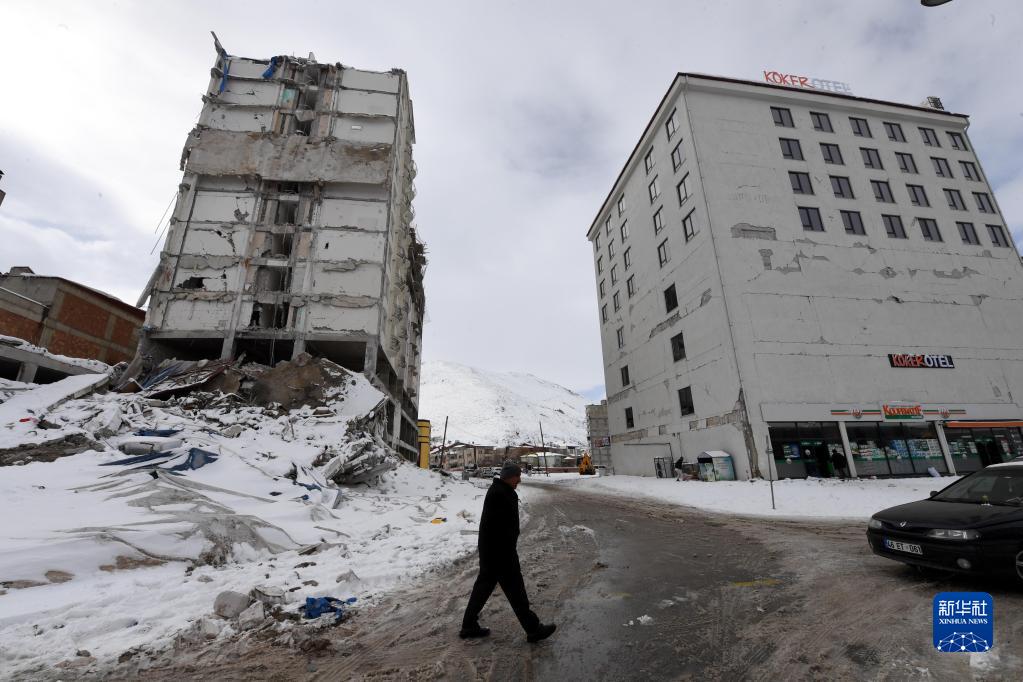 2月7日,在土耳其卡赫拉曼马拉什省的埃尔比斯坦地区,一名男子经过地震中受损的建筑物。