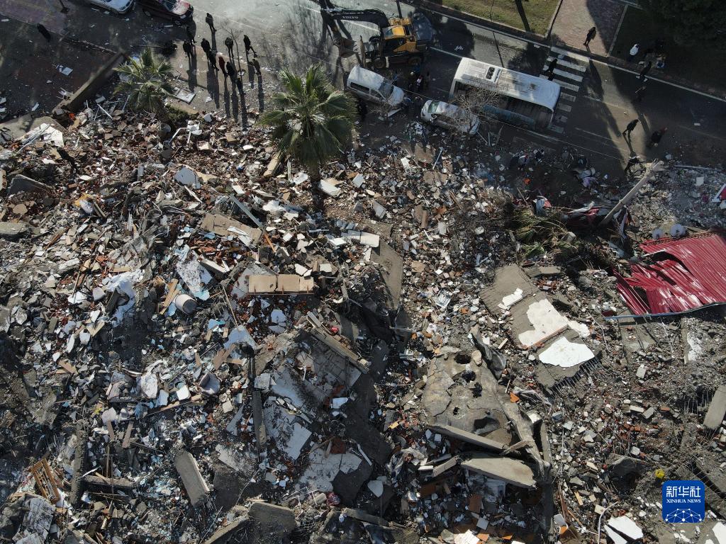 这是2月7日在土耳其南部卡赫拉曼马拉什市市中心拍摄的震后景象(无人机照片)。卡赫拉曼马拉什市是本次地震重灾区卡赫拉曼马拉什省省会,是遭受地震破坏最为严重的城市之一。