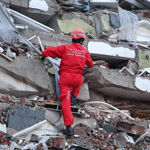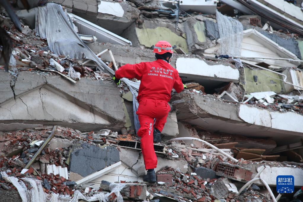 2月7日,在土耳其南部卡赫拉曼马拉什市市中心,救援人员在搜救。卡赫拉曼马拉什市是本次地震重灾区卡赫拉曼马拉什省省会,是遭受地震破坏最为严重的城市之一。