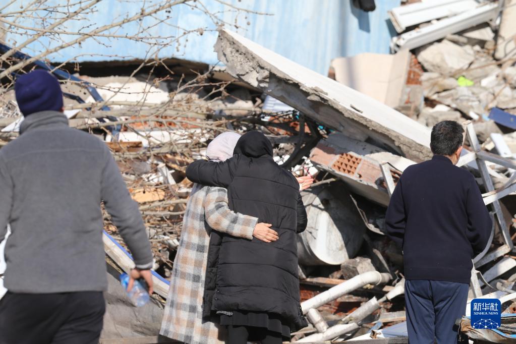 2月7日,灾民在土耳其南部卡赫拉曼马拉什市一处地震废墟前相互安慰。