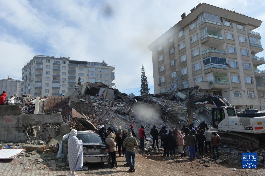 2月7日,人们聚集在土耳其南部卡赫拉曼马拉什市一处地震废墟。