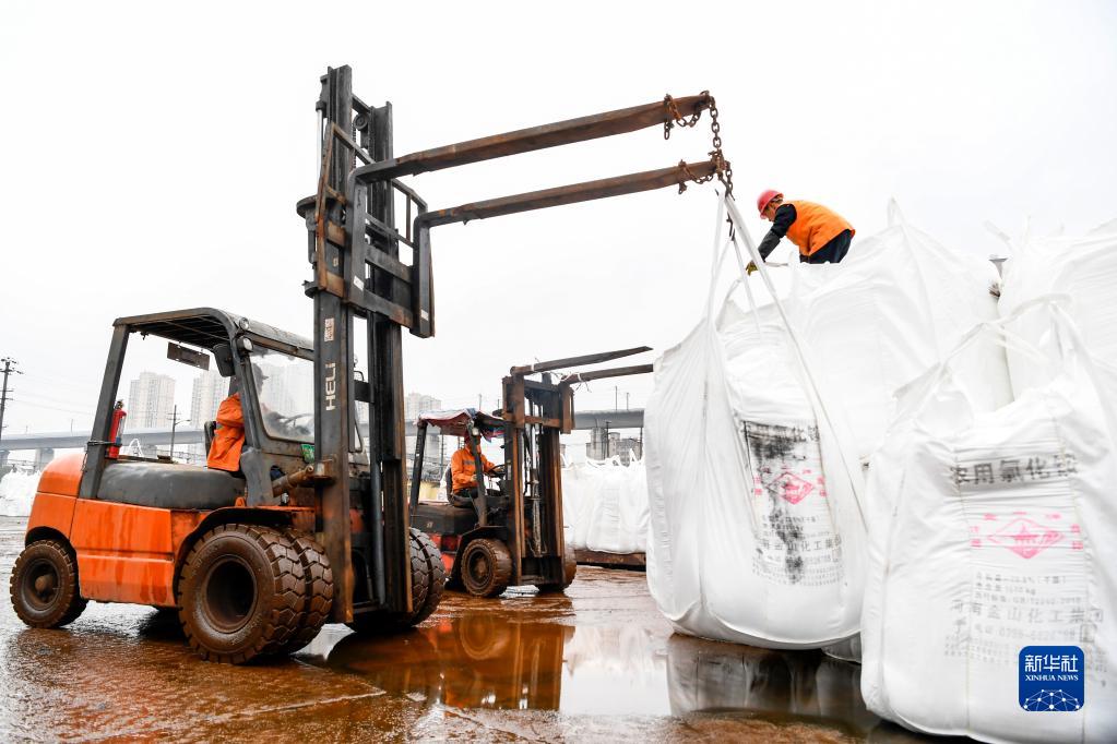 2月7日,江西省宜春西火车站的工作人员在装卸化肥。