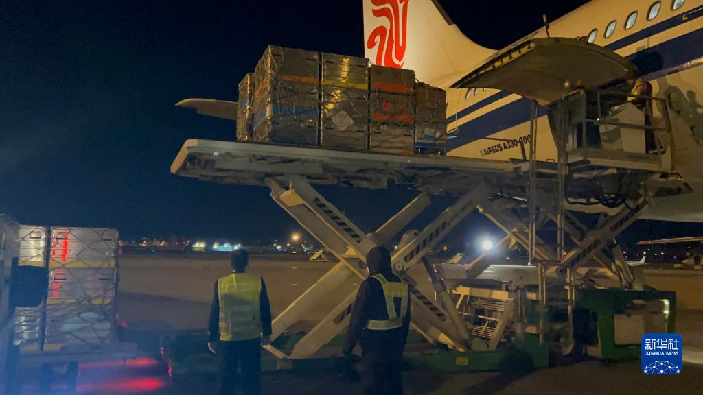 2月8日,工作人员在土耳其阿达纳机场卸运中国救援队携带的物资(手机拍摄)。
