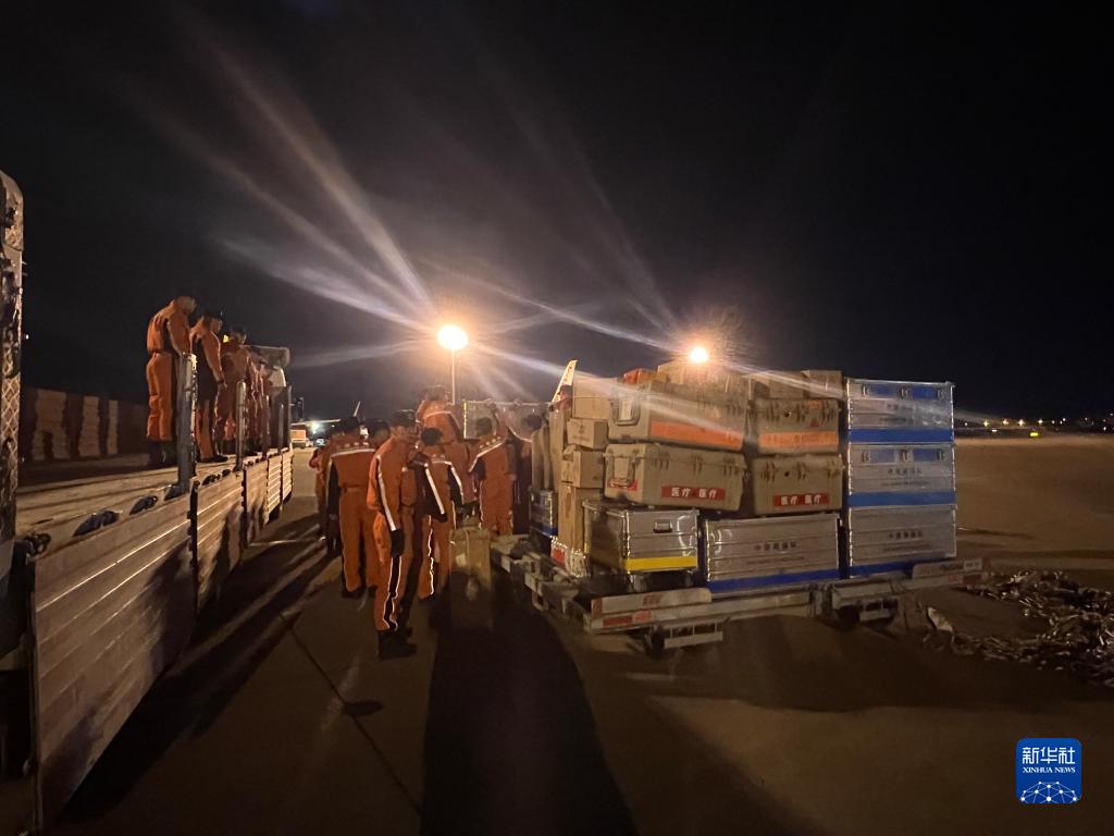 2月8日,中国救援队在土耳其阿达纳机场卸运物资(手机拍摄)。