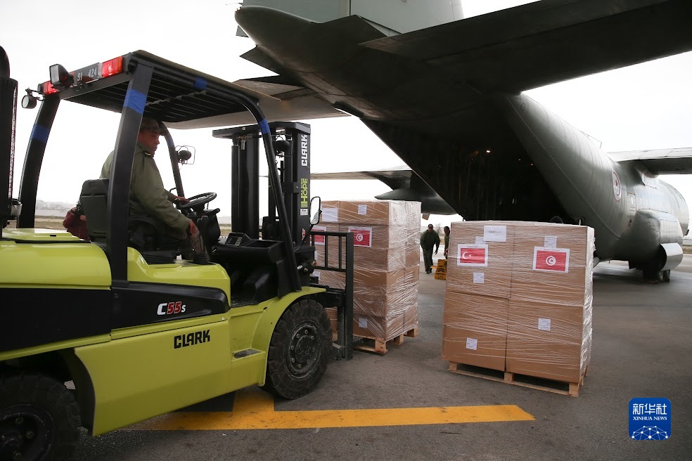 2月7日,工作人员在突尼斯迦太基国际机场装载救援物资。突尼斯政府当日向土叙两国分别派出医务、救援人员并提供救援物资。