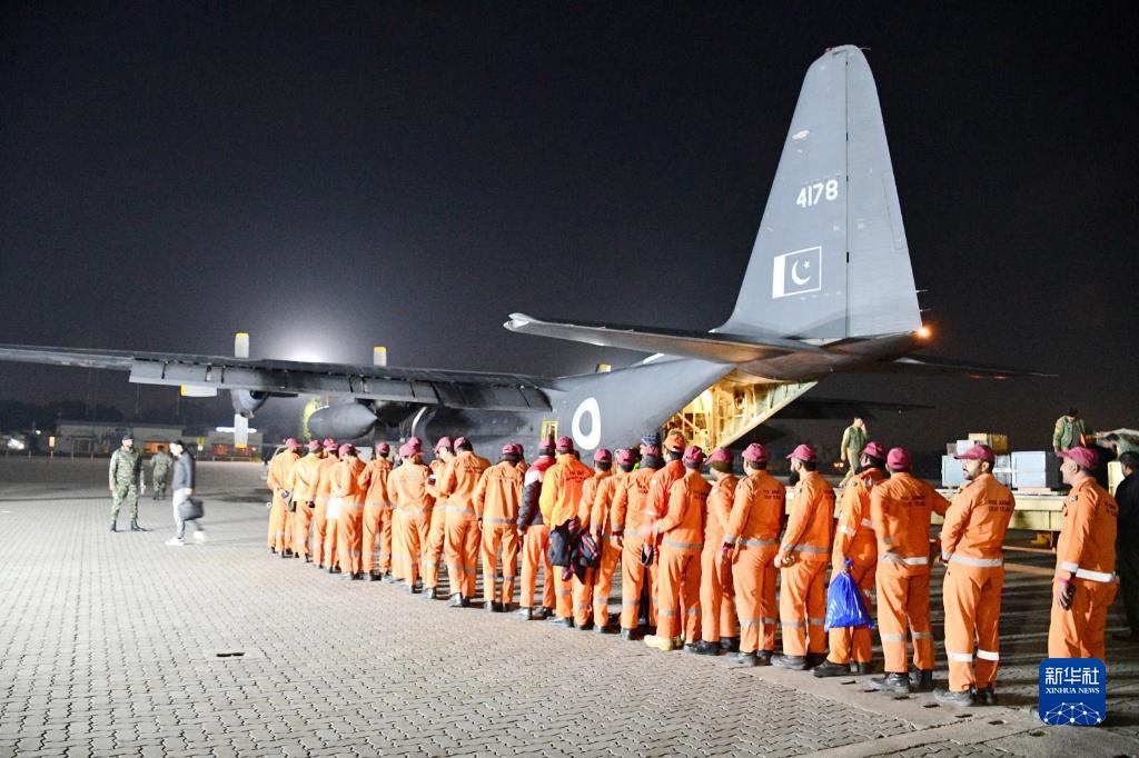 2月7日,在巴基斯坦拉瓦尔品第的努尔汗空军基地,救援队队员准备飞赴土耳其。