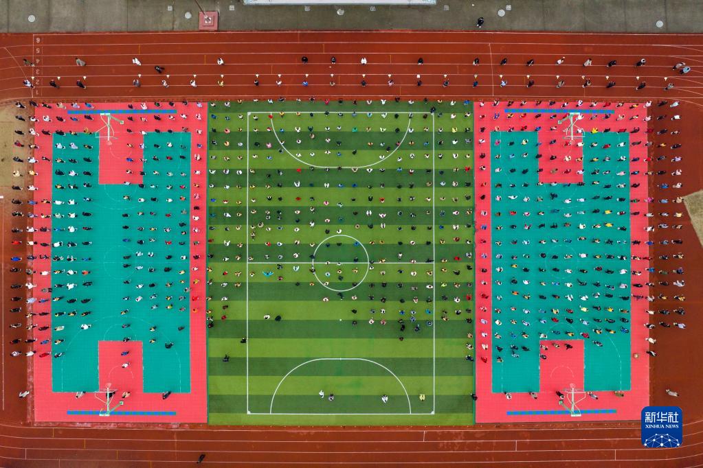 2月8日,浙江省余姚市黄家埠镇中心小学的学生们在做体操(无人机照片)。