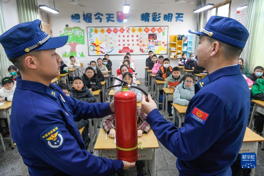 2月8日,在四川省广安市广安区思源小学6年级7班,消防员向学生讲解灭火器的使用技巧。
