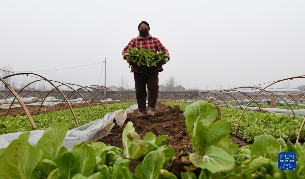 2月8日,农民在河南省济源市克井镇勋掌双峰村白菜制种育苗基地苗床起苗。