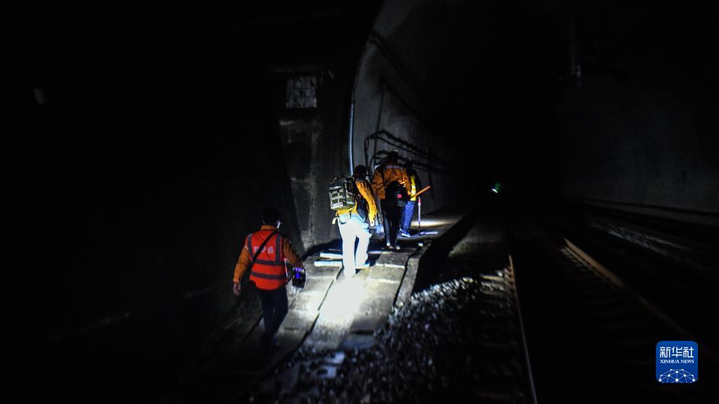 2月8日,钦州电务段钦州高铁通信车间的通信工进入高铁隧道巡查。