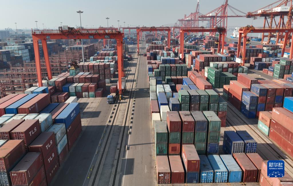 2月8日,唐山港京唐港区的工人在集装箱码头堆场操作机械设备吊装集装箱(无人机照片)。