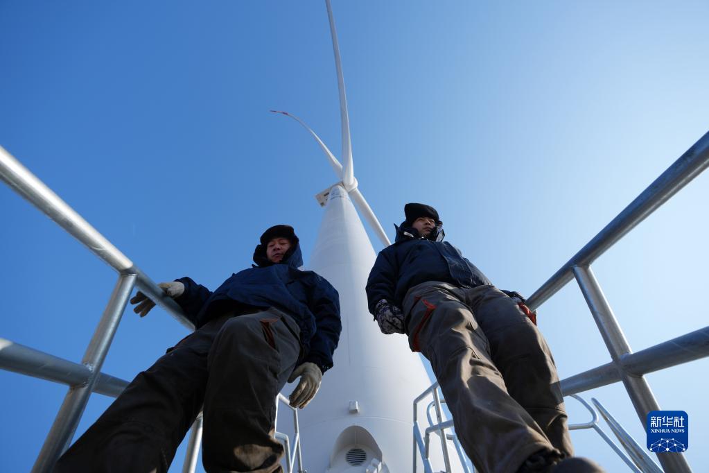 2月7日,在华电黑龙江区域哈尔滨依兰鸡冠山风电场三期工程一处运行的风电机组,工作人员在进行巡检。