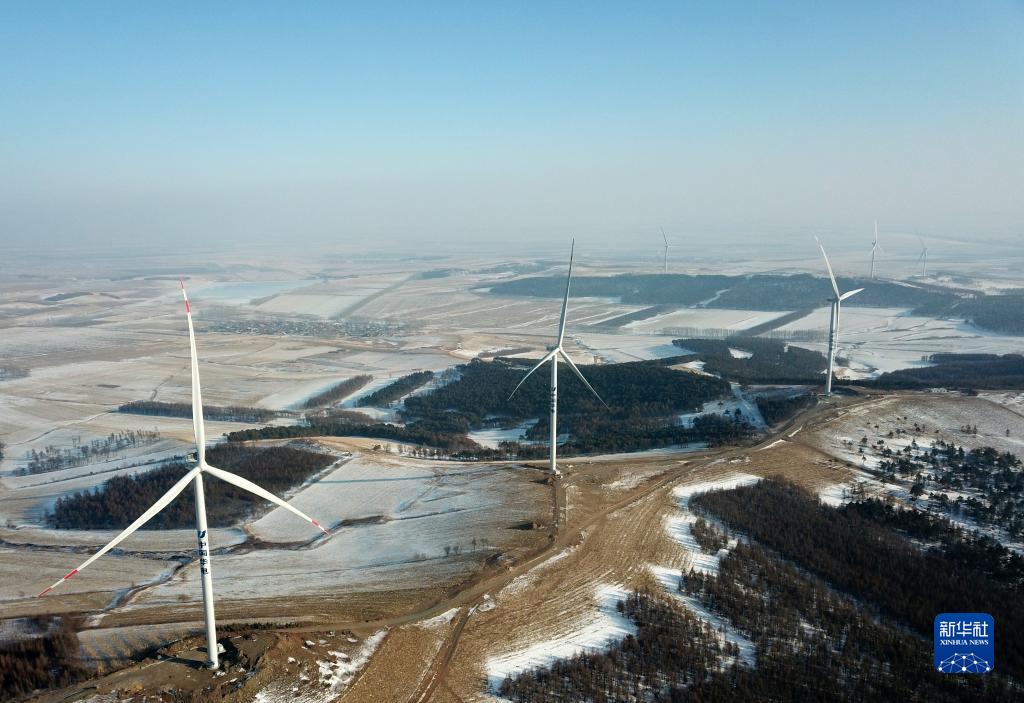 2月7日拍摄的华电黑龙江区域哈尔滨依兰鸡冠山风电场三期工程部分运行的风电机组(无人机照片)。