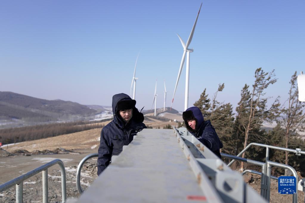 2月7日,在华电黑龙江区域哈尔滨依兰鸡冠山风电场三期工程一处运行的风电机组,工作人员在进行巡检。
