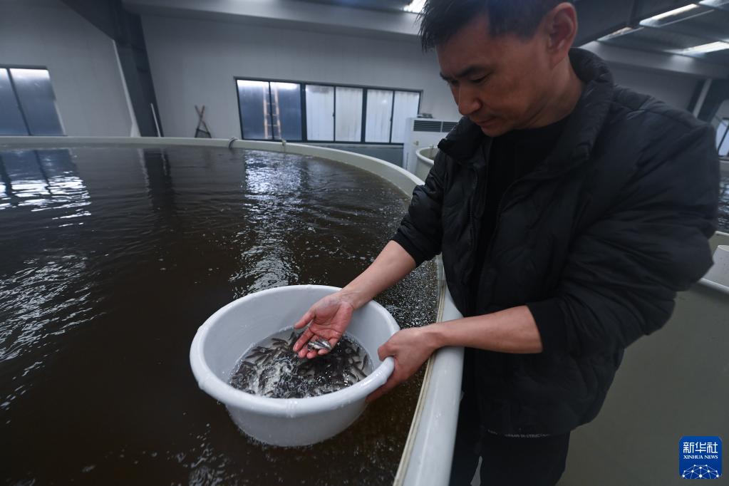 2月8日,在位于湖州市织里镇的渔大哥水产养殖专业合作社育苗室内,工作人员查看鲈鱼苗的长势。