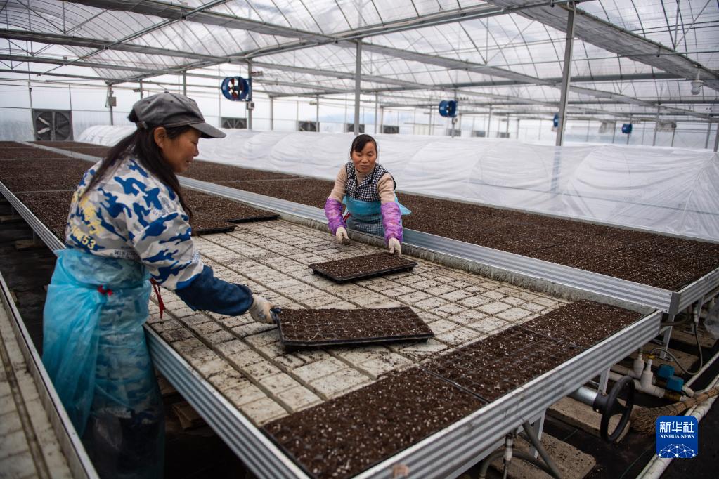 2月8日,在鼎城区国家现代农业产业园一处蔬菜育苗基地,工作人员在摆放蔬菜育苗盘。