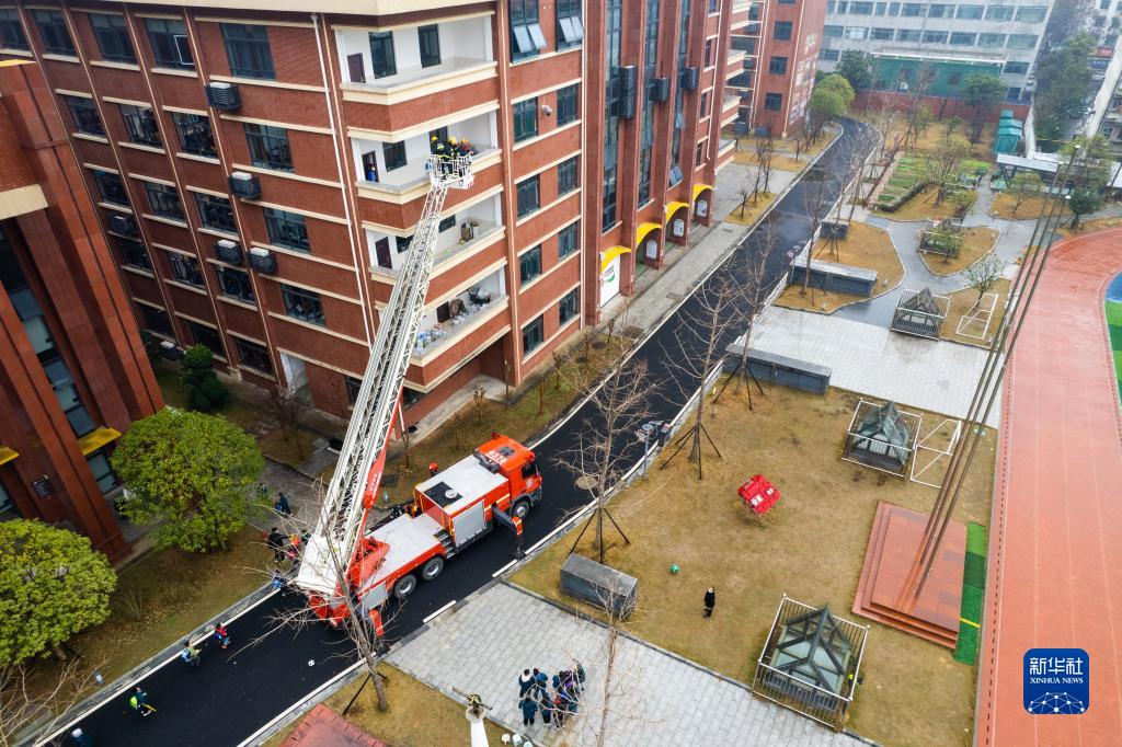 2月8日,在常德市武陵区第一小学教学楼,消防队员在进行高空营救被困学生演练(无人机照片)。