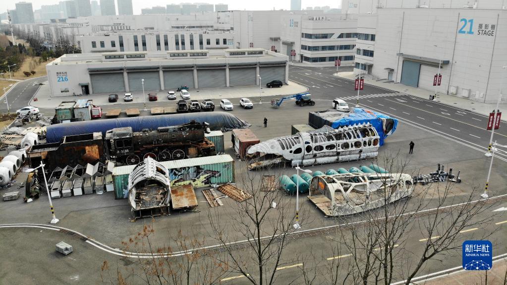 青岛东方影都影视产业园置景车间外堆放的部分影视道具(2月8日摄,无人机照片)。