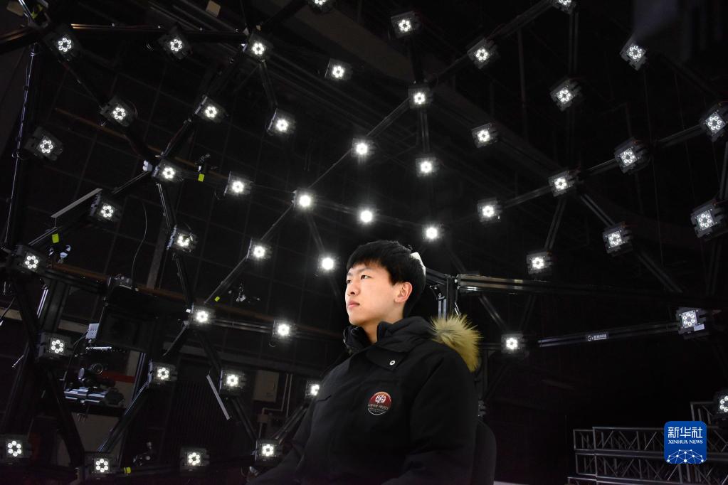 2月8日,青岛东方影都影视产业园一名工作人员在演示微表情捕捉技术。