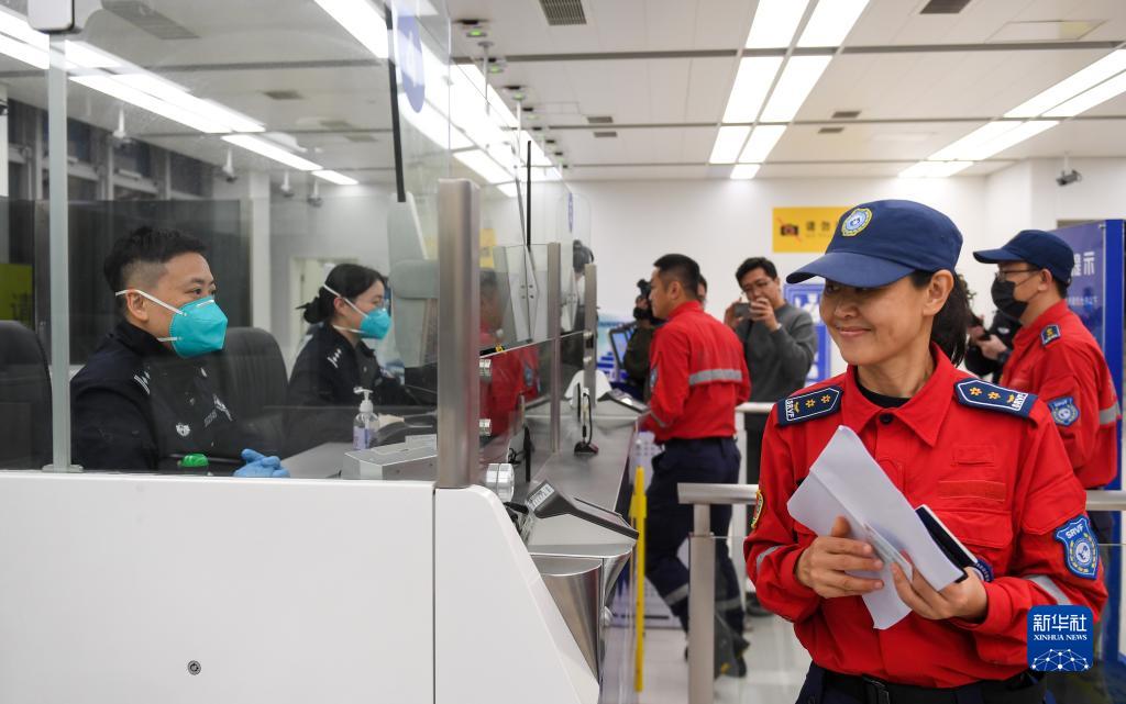 2月8日,在深圳湾口岸边检查验台,深圳公益救援队先遣队队长陈媛(右)完成查验准备出发前往香港国际机场。