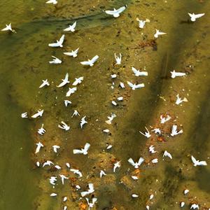 近日,在山东省青岛市城阳区流亭街道墨水河入海口湿地,各种水鸟或赶潮觅食或翩跹飞翔,绘就一幅美丽的生态画卷。