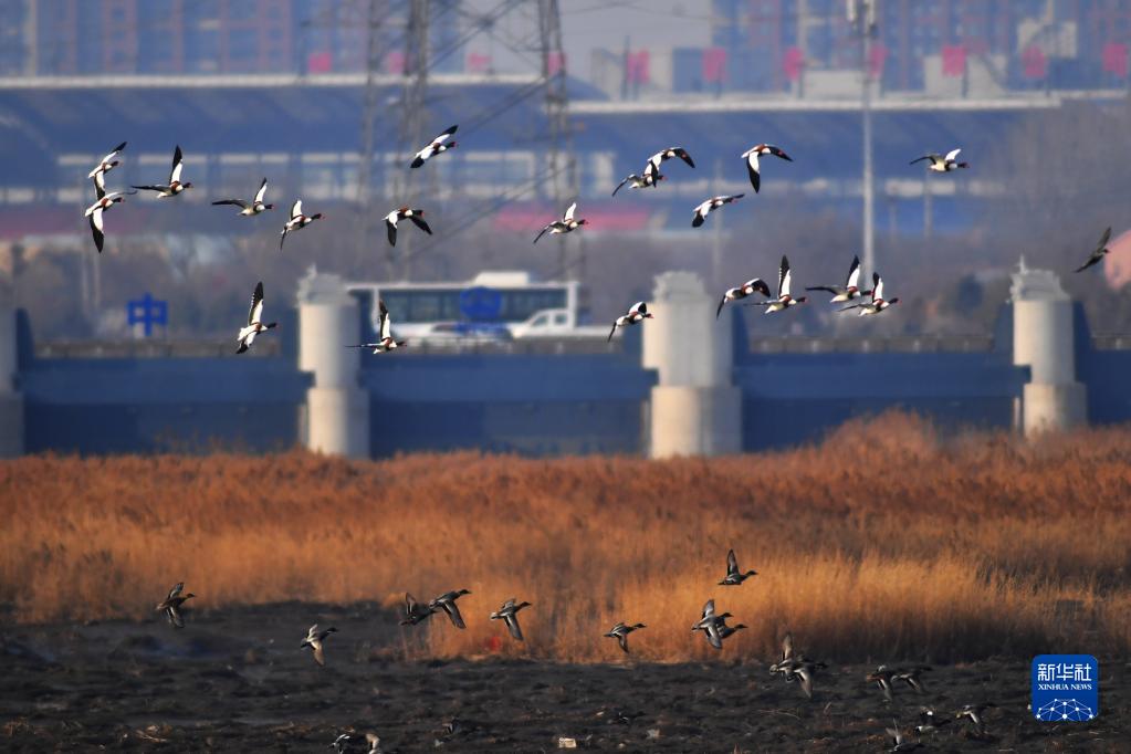 2月8日,在山东省青岛市城阳区流亭街道墨水河入海口湿地,成群水鸟翩跹飞翔。