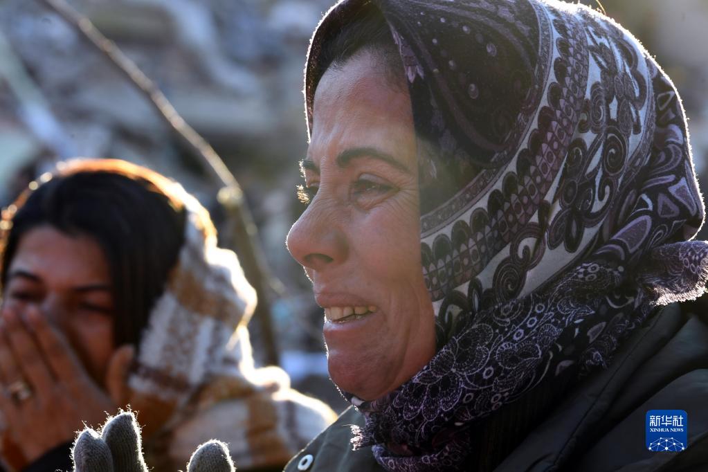 2月8日,在土耳其哈塔伊的一处地震废墟,当地居民等待亲人的消息。