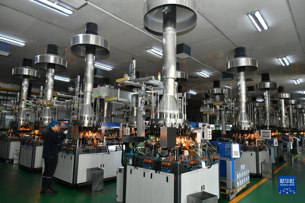 2月8日,在位于河北省沧县的沧州四星玻璃股份有限公司,工人在药用中性硼硅玻璃管制瓶车间工作。