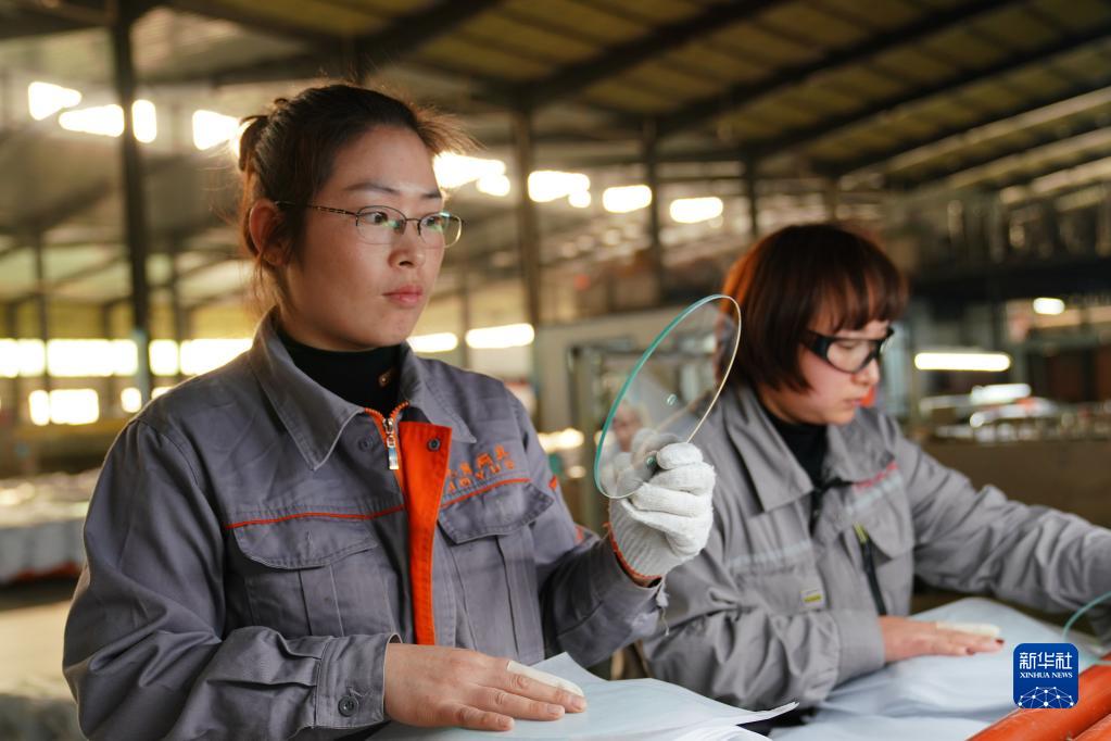 2月6日,在位于河北省沙河市的河北九月厨具股份有限公司,工人在检查锅盖玻璃配件的质量。