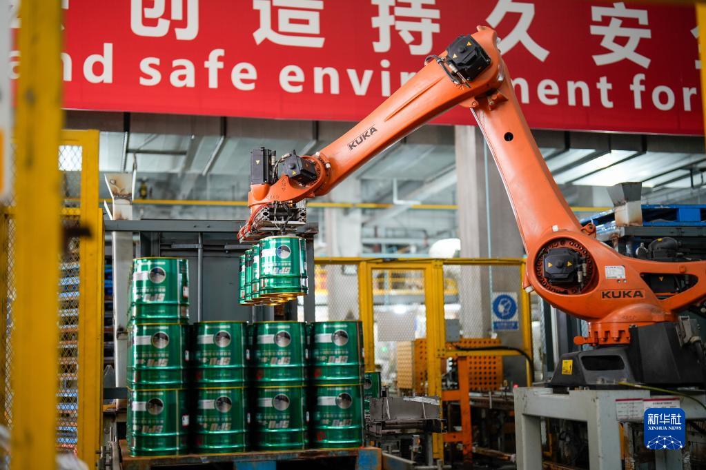 2月2日,在位于河北省唐山市丰南区的唐山东方雨虹防水技术有限责任公司,机械手臂在运输产品。